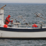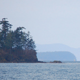 | And the seagulls seem to enjoy the bait scraps. There is a touch of sun on the Lummi's flank, but Lummi Peak (el.1657') is hidden in the clouds. The southern tip of Lummi is Carter Point. | |||
