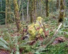 | Just a pic ot the river and the Spring greenery. The clouds kept the rugged Cascade scenery well hidden for most of the day. | Ferns and moss on an old tree, taken from below. Do you think it rains alot? | This is pretty much how the forest looks as you begin to climb out of the valley floor. |