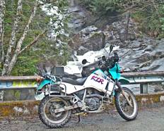 | Here's Bill McAvan and his KLR, during a little rest stop about a third of the way up the hill. | Of course, here's the manditory bike pic at Dingford Creek Falls. | And another one of the KLR, with trick suspension, auxillary fuel tank and communications gear. |