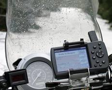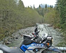 | Here's SoloLobo at Dingford Creek Falls on his beautiful airhead. His buddy Coopville, had a very nice Transalp. We played leapfrog almost all the way up the Middle Fork. I probaly should have stopped to be more social, but I needed to ride.....just one of those kinda days, | Well, here it is, the end of the line. Snow so heavy and waterlogged that even the 4-wheelers didn't bother. Actually, the end of the road is only about another 100 yards. Then you have to hike into the Alpine Lakes Winderness. | An elevation of 2,565 is all we could get today.....but we definitely got a workout. The last pitch of washout rocks and shale was a good challenge. It was hard to find a reasonable line through the rocks....and too steep to slow down... |